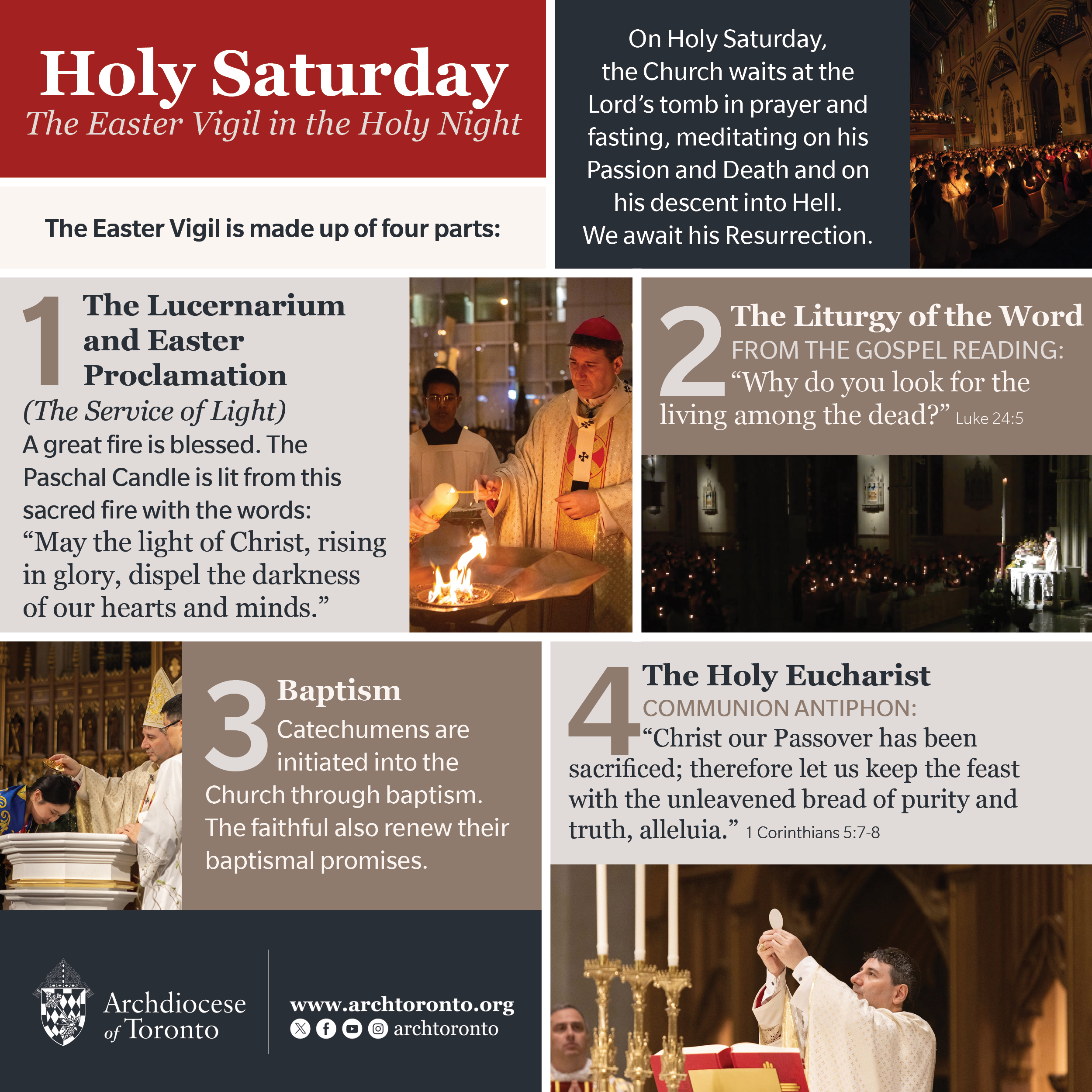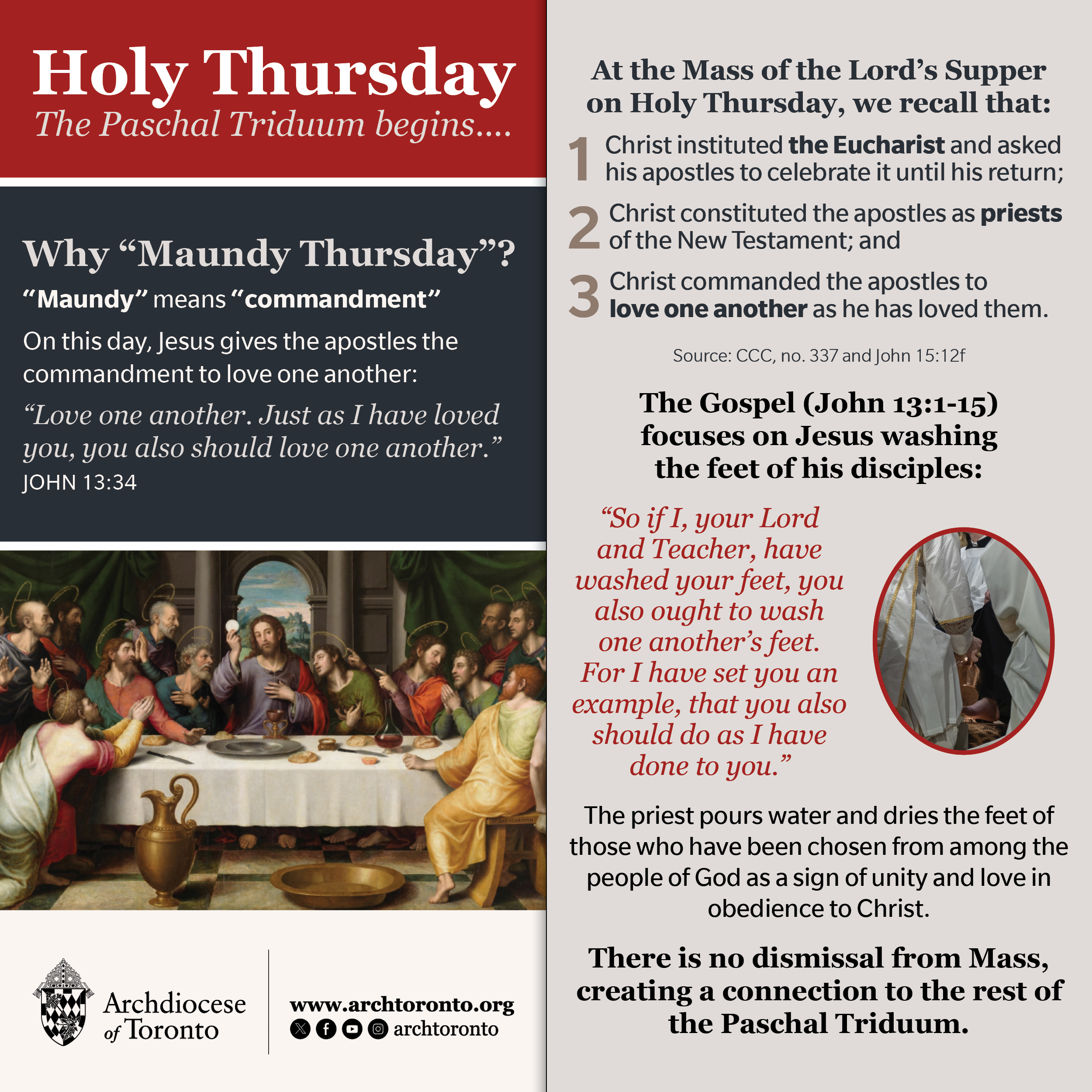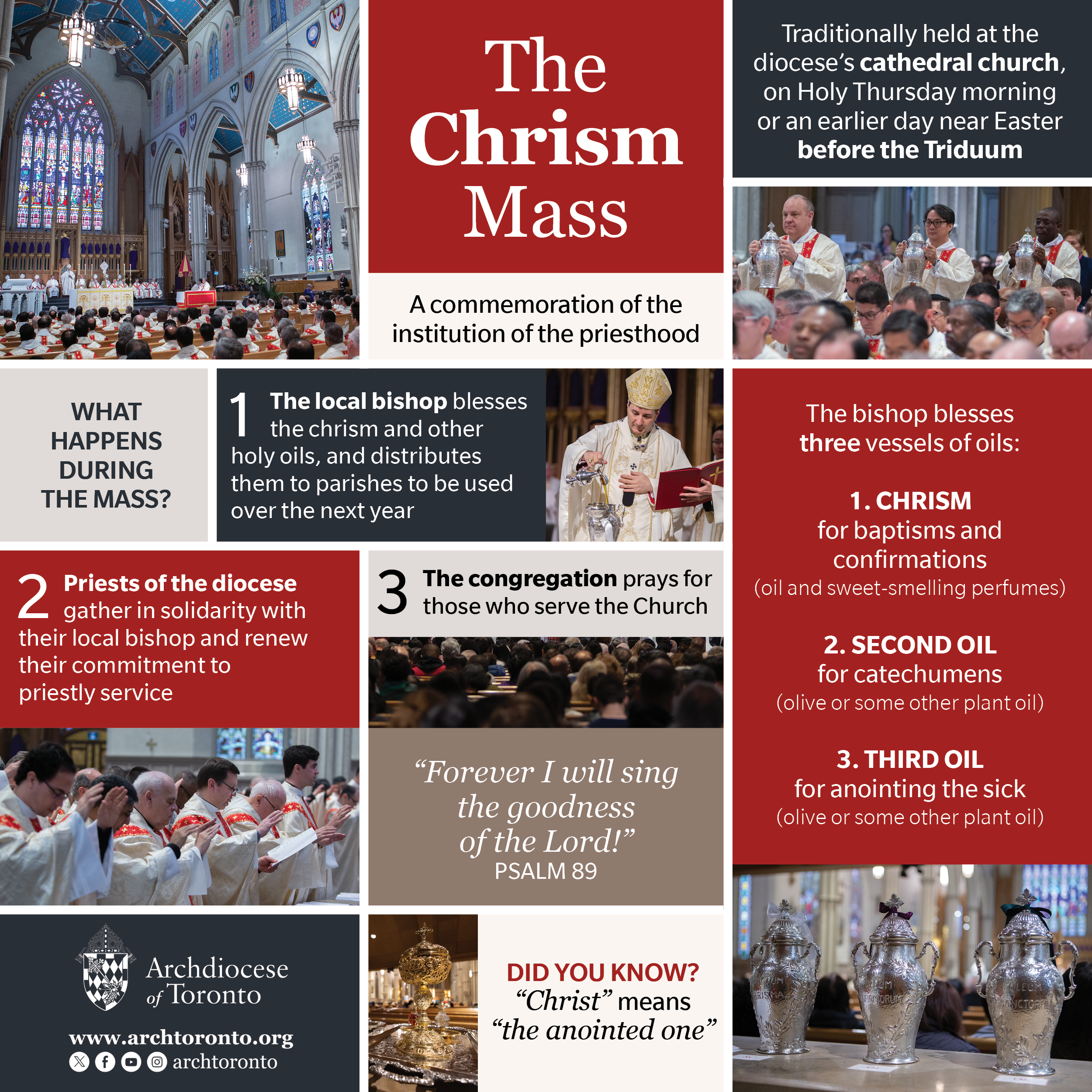 The final week of preparation before Easter Sunday is called Holy Week. These days recount Christ’s final days on earth. Traditionally on the Tuesday of Holy Week, the priests of the Archdiocese of Toronto gather for the Mass of Chrism held at St. Michael’s Cathedral Basilica.