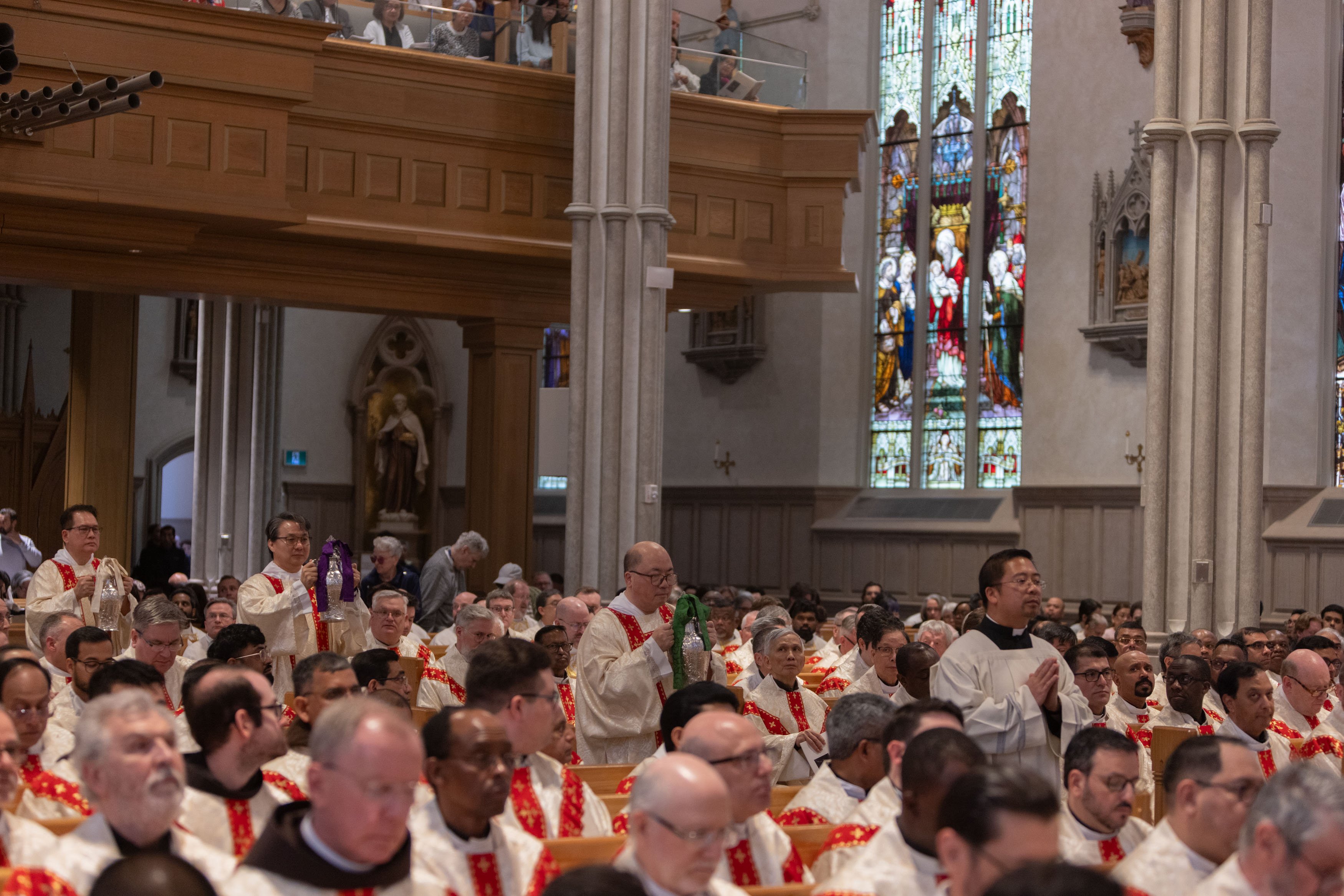 The Chrism Mass also provides an opportunity for priests of the archdiocese to renew their priestly promises and gather in solidarity with their bishop. At this year’s celebration, there were upwards of 350 priests in attendance – alongside 37 permanent deacons and 31 seminarians. Of special note, this year’s Mass recognized 26 Jubilarian priests celebrating 25, 50, 60 and 75 years since their ordination to the priesthood.